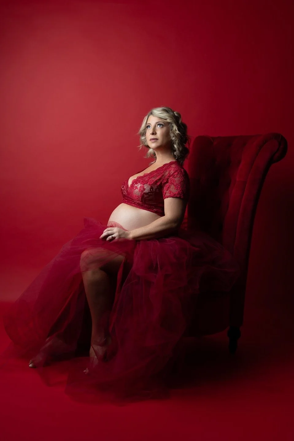 Maternity boudoir sessions are so much fun in the studio. I have found that sometimes an entire boudoir session is a little much on my Mamas that are further along in their pregnancy and we have curated the perfect experience that gives the best of both worlds in maternity sessions. These special sessions will start with a gown image or other non-boudoir outfit of your choosing in the studio. This will help you get comfortable having your photos taken before we begin the boudoir portion. Poses for this look will not be light hearted and non-strenuous. After the initial outfit we will go with your boudoir looks. Depending on the package of your choosing, we will do 1-3 boudoir looks with different posing and set ups. The shower set up can be one of your set choices and makes a nice way to end the session.
